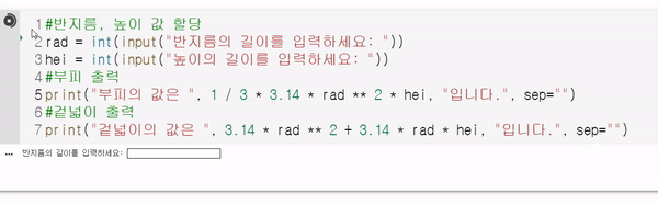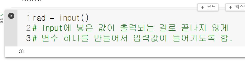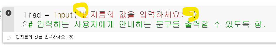 rad = input("반지름의 길이를 입력하세요") ---------- input으로 숫자를 입력받아 rad에 넣음.