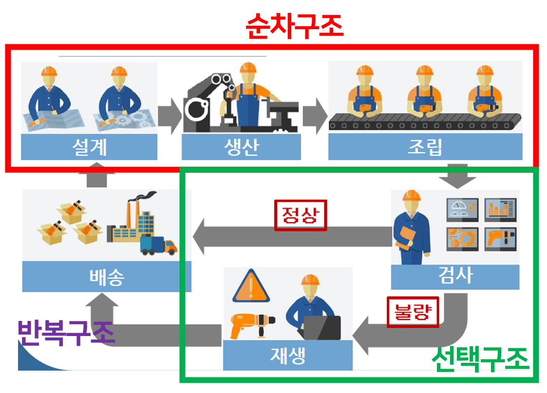 설계 → 생산 → 조립 → 검사 → (불량) → 재생 → 배송 → .... 반복
