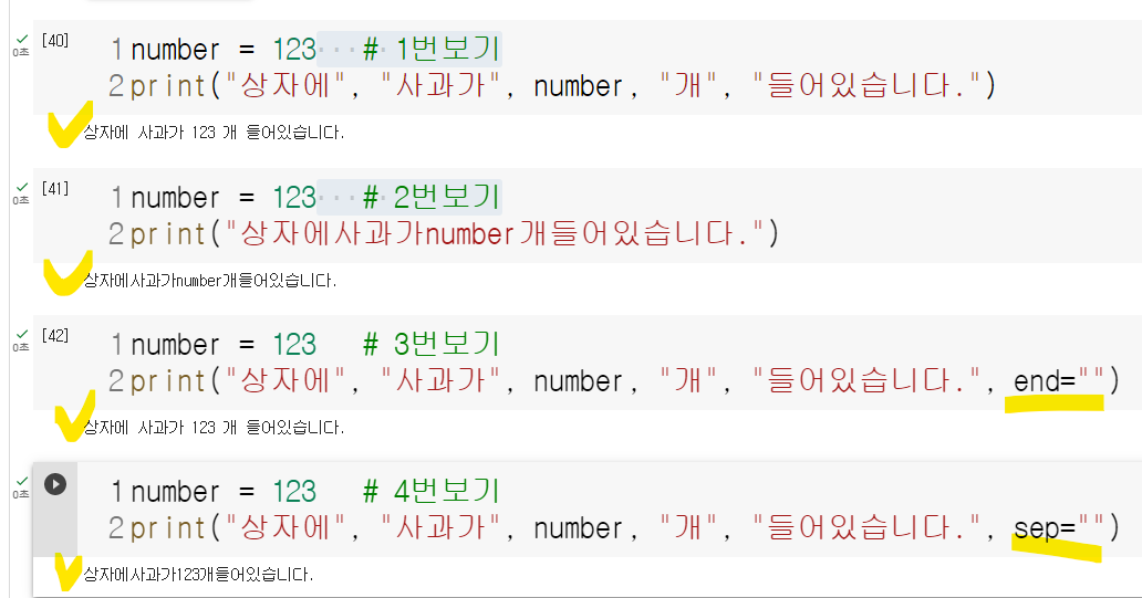 - 기본적으로 sep은 공백 문자열(" ")로 설정되어 있어서, 파라미터들 사이에 공백이 자동으로 추가됨.