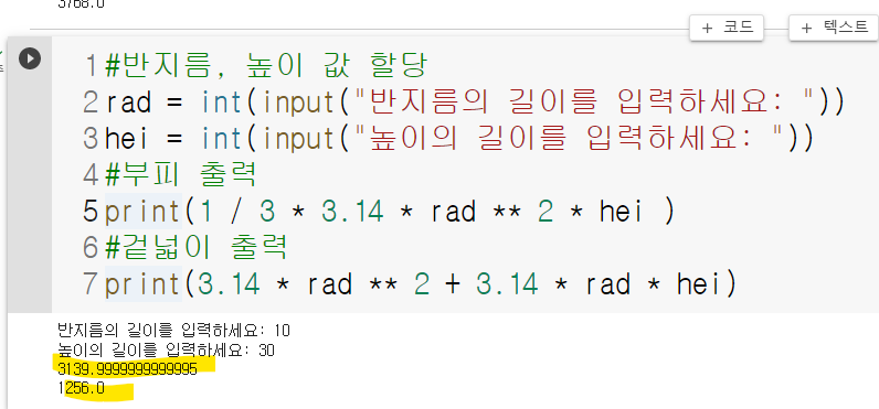 사용자로부터 반지름과 높이를 입력받아서 계산하고 싶음.