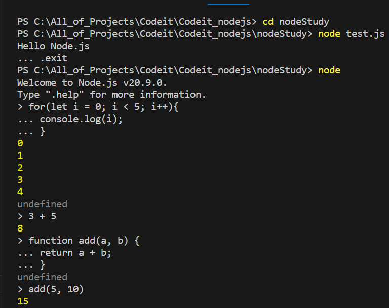 파일 안의 자바스크립트 코드를 통째로 실행하는 게 아니라 노드와 대화하는 것처럼 코드를 실행함.