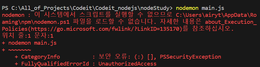 보안 오류 때문에 nodemon 설치 후 실행 불가능한 경우