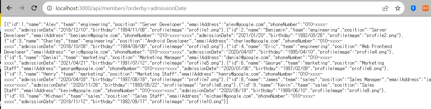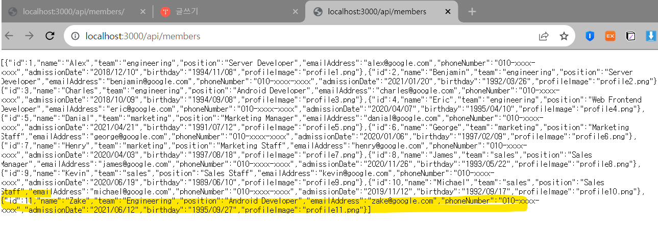 send(members) : send 메소드가 배열을 json 문자열로 변환한 결과를 response의 body에 담아서 보내줌