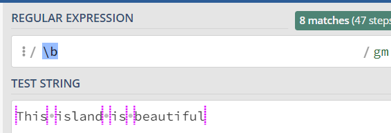 - \b : 문자(\w)와 문자가 아닌 곳(\W) 사이의 위치에 해당하는 경계