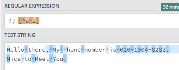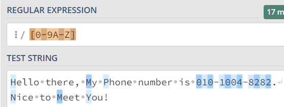 - REGULAR EXPRESSION : 원하는 정규 표현식 작성, TEST STRING 부분 중 일치하는 부분이 하이라이트 됨.