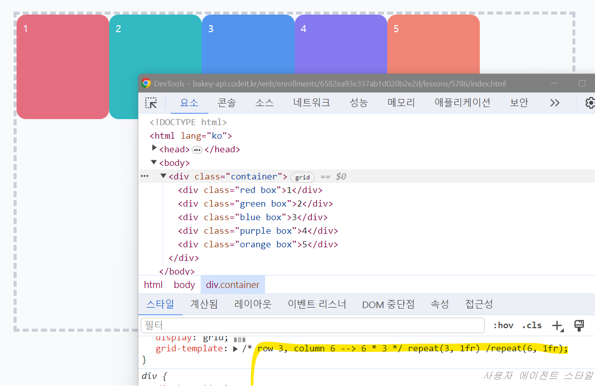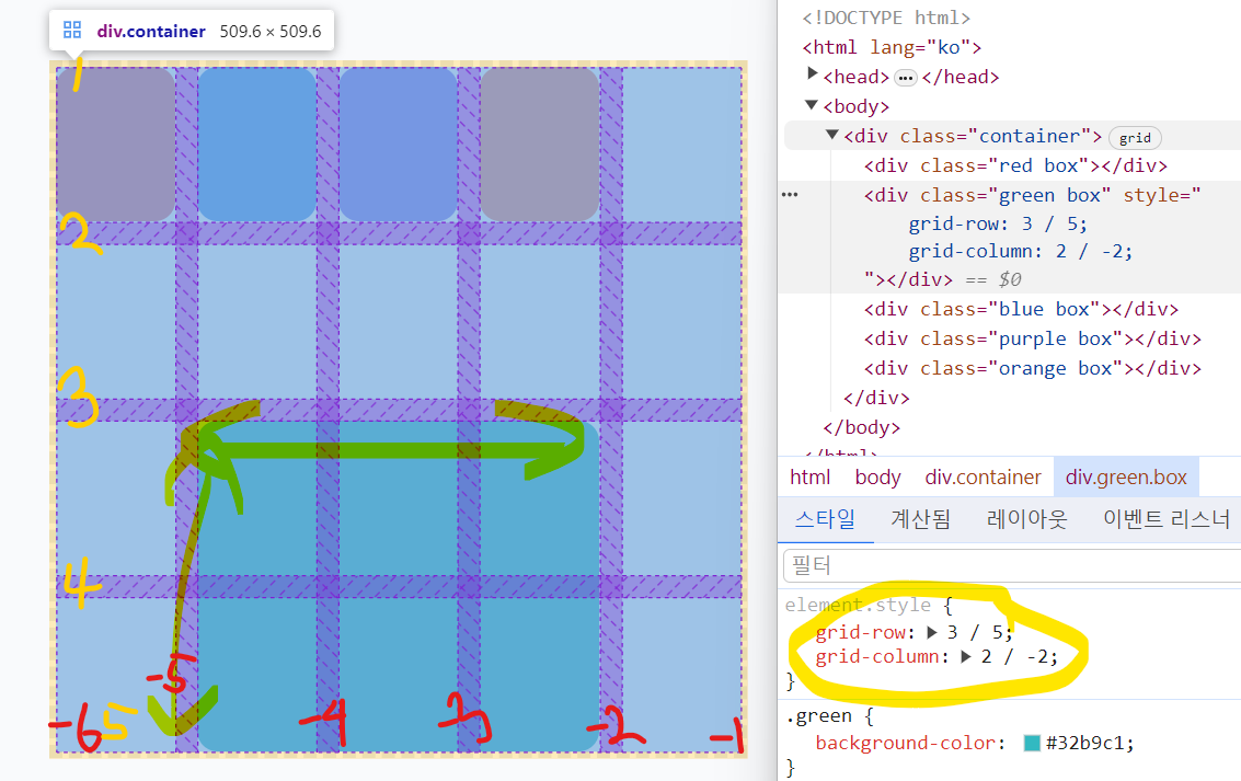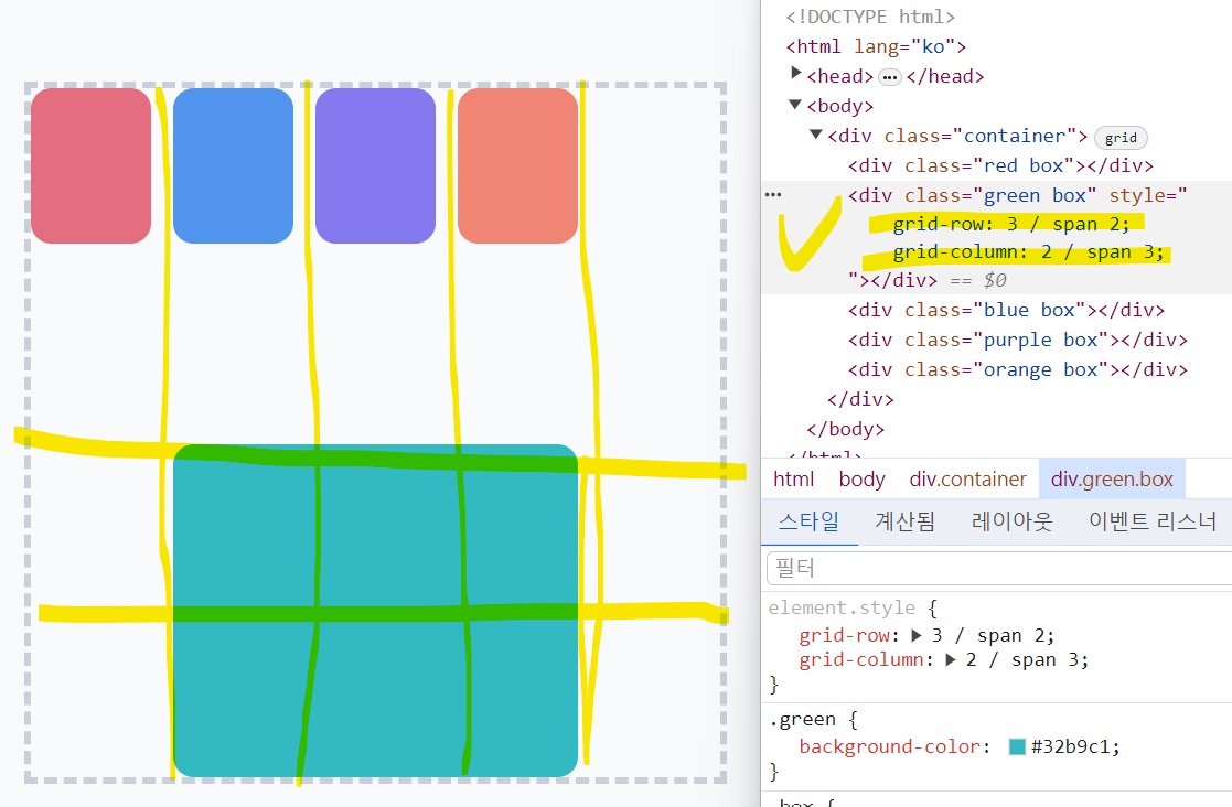 - 원하는 위치에, 여러 칸에 걸쳐서 배치 : grid-row(column), span