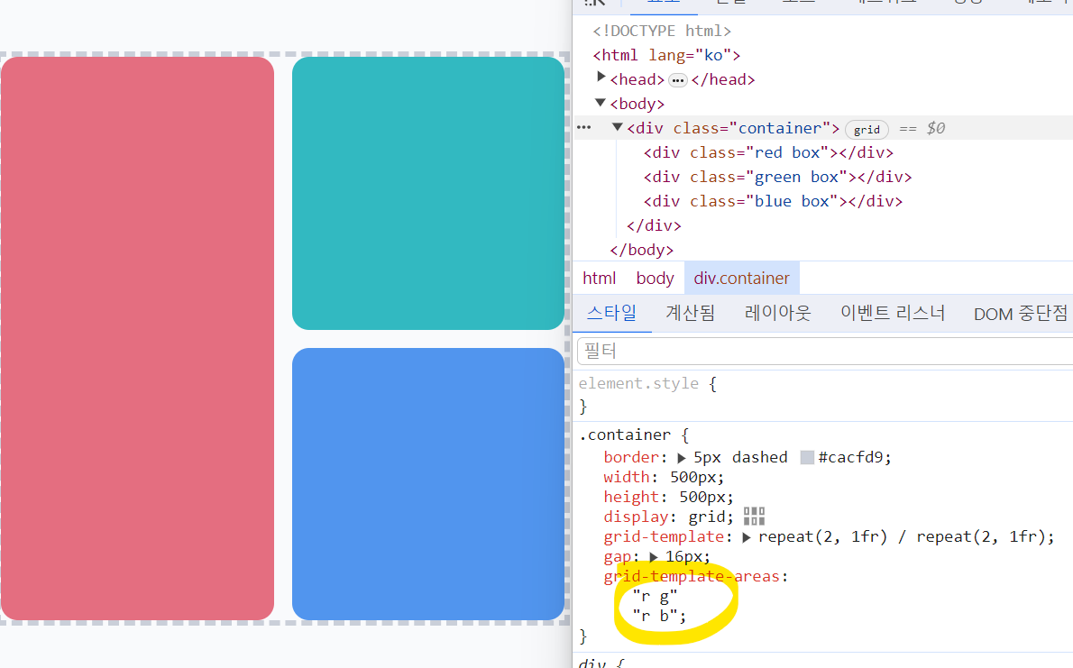 - grid-template-areas : 배치하고 싶은대로 배치하기 (비워두고 싶은 부분은 마침표)