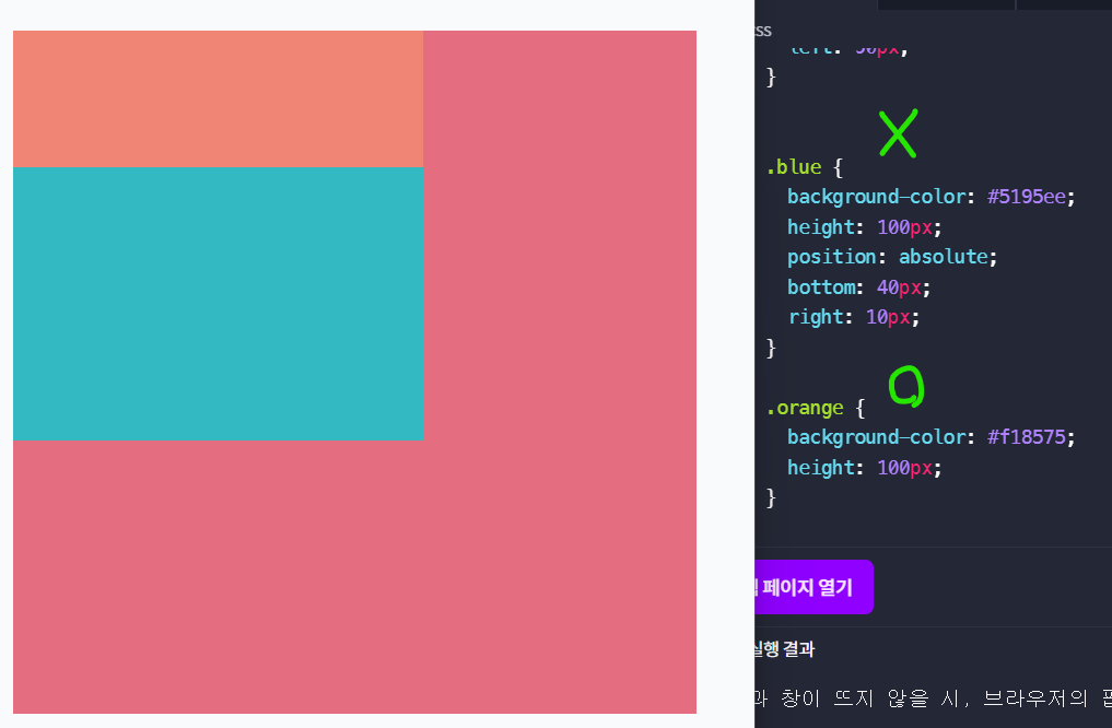 position: absolute; /* position이 static이 아닌 조상요소 .green */