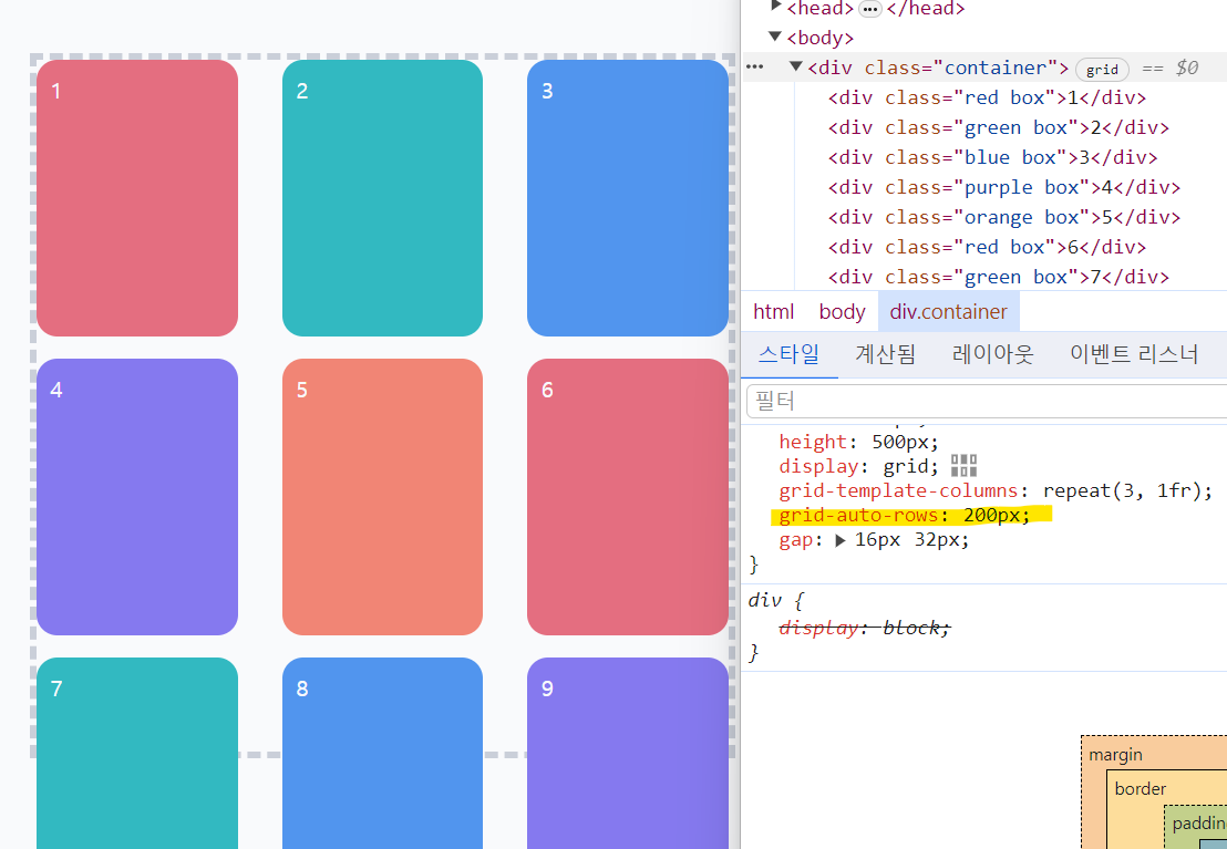 - 크기 미리 정하기 : grid-auto-rows(columns)