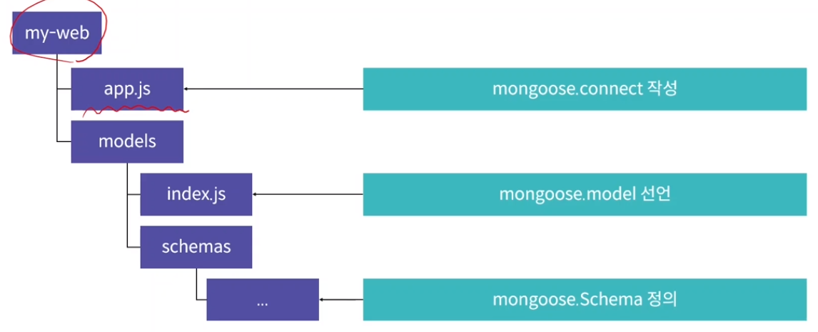 Express.js는 프로젝트 구조를 자유롭게 구성할 수 있기 때문에 어느 부분에 Mongoose ODM을 위치시키면 좋을지 적절한 위치를 결정하는 것이 중요함.