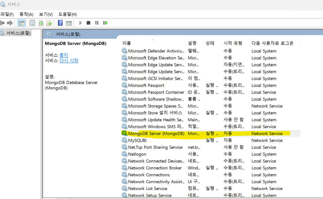 컴퓨터가 실행되면 항상 MongoDB 서버가 실행된다는 의미임.