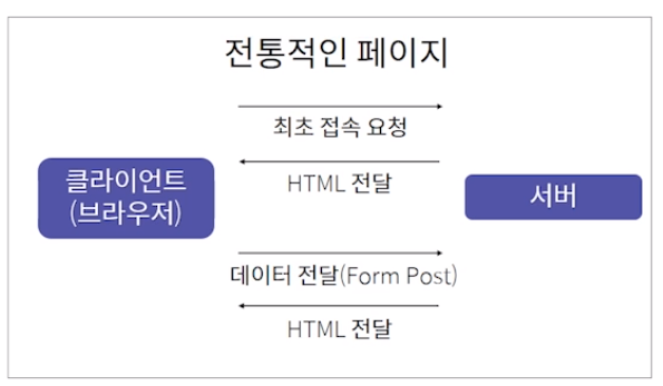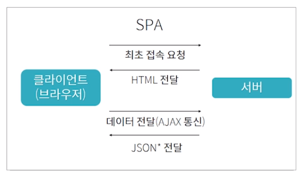 | · 최초에 서버로부터 HTML을 전달 받고 페이지의 변경이 필요할 때 다시 서버에 요청하여 HTML을 전달 받는다. | · 최초에 서버로부터 HTML을 전달 받고 페이지의 변경이 필요할 때 변경이 필요한 부분을 JSON으로 전달 받는다. |