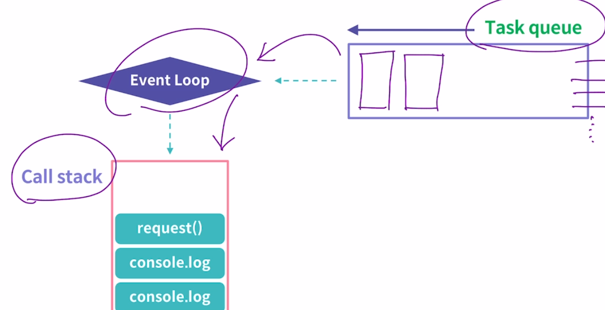 → call stack이 비워지고 여유가 있을 때에만 event loop가 task queue에서 task를 꺼냄.