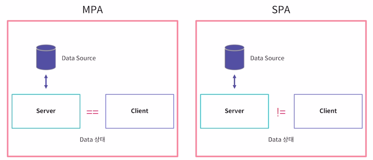 - MPA에서는 서버의 데이터를 이용해 페이지를 렌더링하므로, 클라리언트의 데이터와 서버의 데이터가 큰 차이를 가지지 않음.