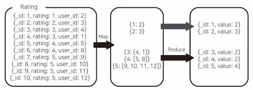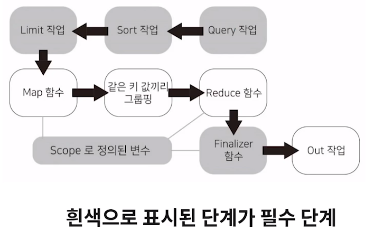 - 맵-리듀스 : 정해진 루틴에 맞는 함수를 작성해서 집계 연산 가능