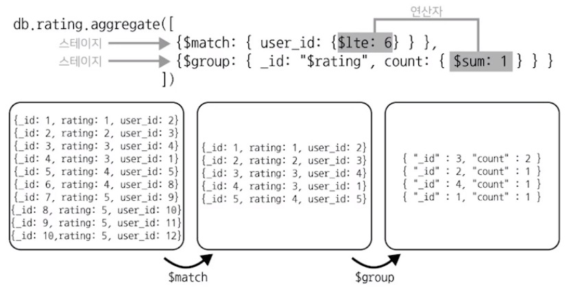 - 집계 파이프라인 : 미리 정해진 집계 스테이지대로 연산해야함.