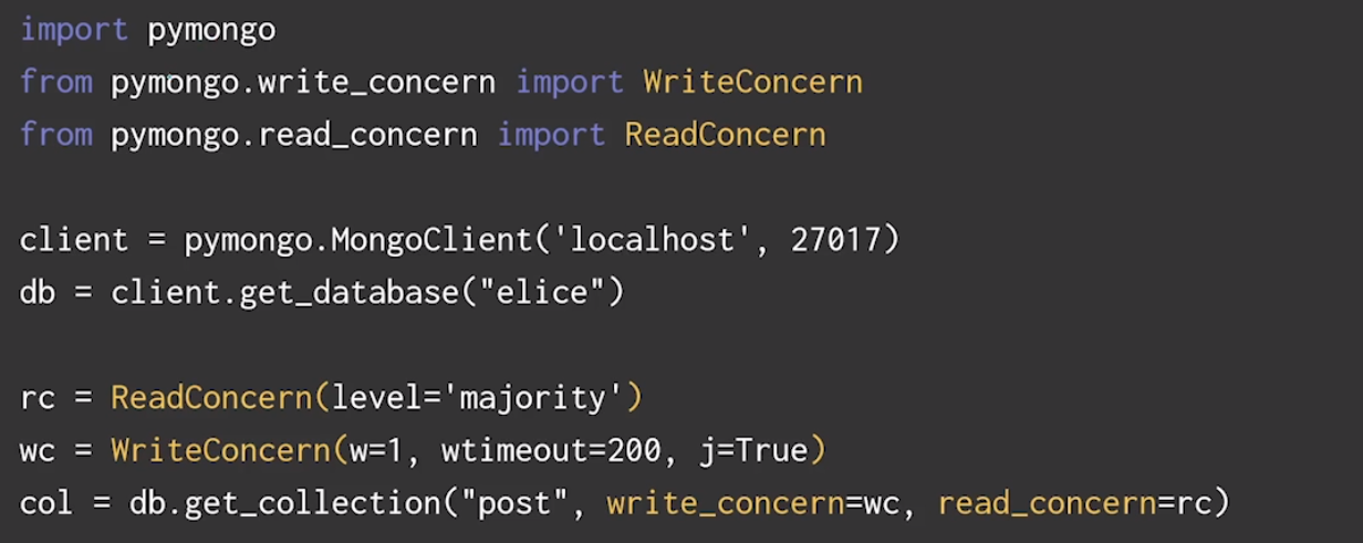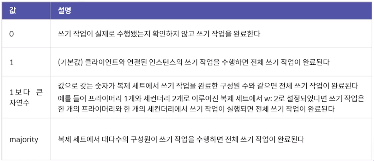 - Write-Concern: 어느 정도 동기화 수준을 기준으로 쓰기 작업을 마무리할지 설정