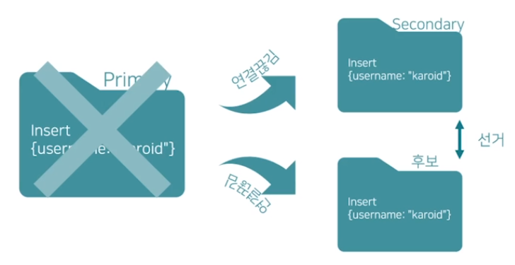 - 프라이머리가 무슨 이유에서든지 죽게 되면, 복제 세트 구성원 중 과반수의 세컨더리가 이를 감지하여 선거를 개최하기로 결정한다.