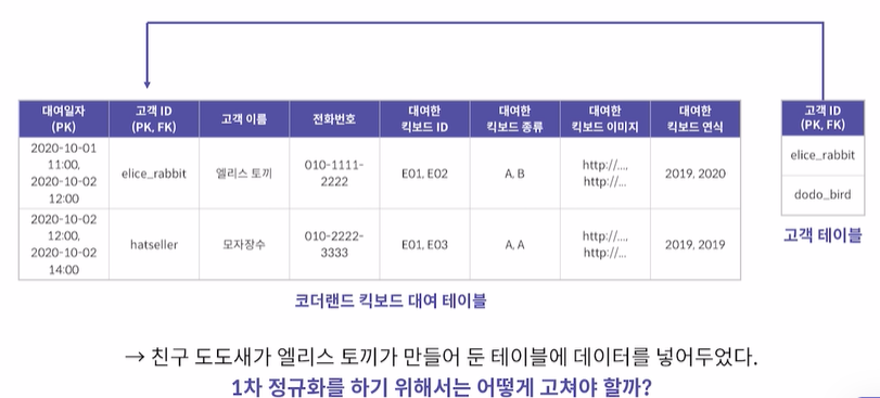 - 각 속성마다 값이 1개씩 존재하도록 하는 과정 (원자화)