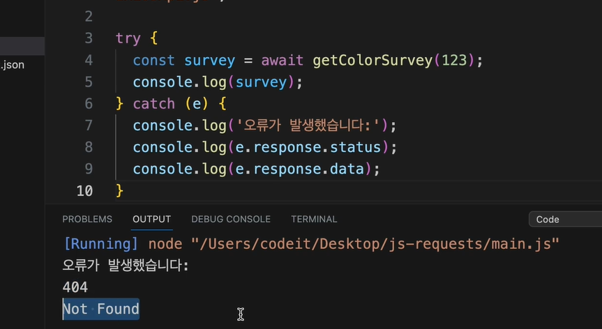 지금은 콘솔에 오류가 나오지만 실제 웹사이트 코드라고 하면 오류메시지를 화면에 보여줄 수 있음.