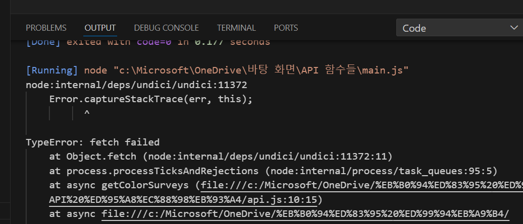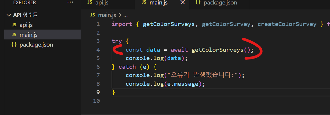 api.js에서 fetch 함수 부분이나, main.js에서 함수를 실제로 호출하는 부분을 try-catch로 감싼다.