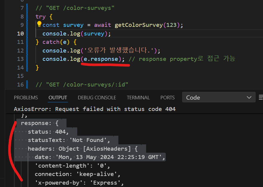 error response가 돌아오면 axios는 에러 객체에 response를 저장해줌.