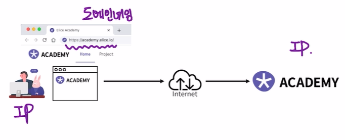 - 사용자가 입력하는 academy.elice.io는 사람이 쉽게 이해할 수 있는 도메인 네임이다.