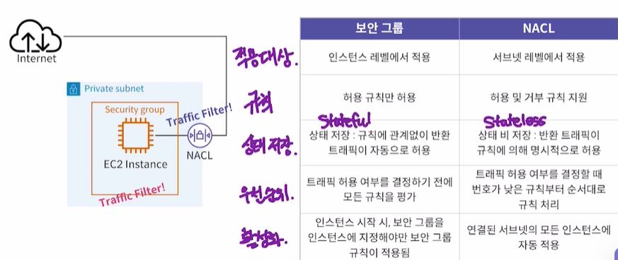 | 적용대상 | 인스턴스 레벨에서 적용 ex. EC2, RDS, 로드밸런서 (서비스별 트래픽 제어) |