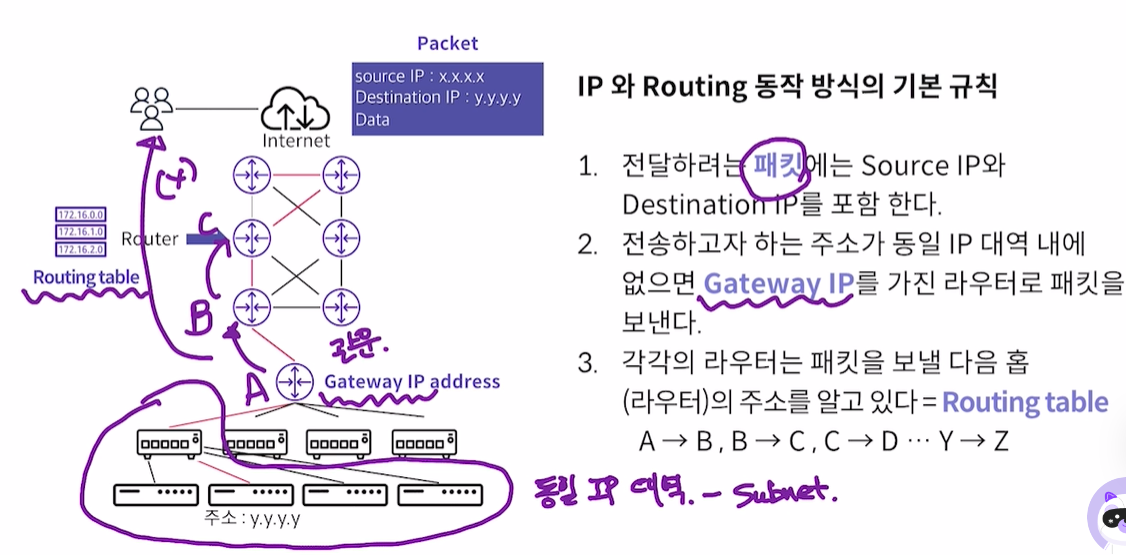 그렇게 다른 IP 대역으로 넘어가기 위해서 게이트웨이IP까지 전달된 패킷은 라우터에서 동작함.