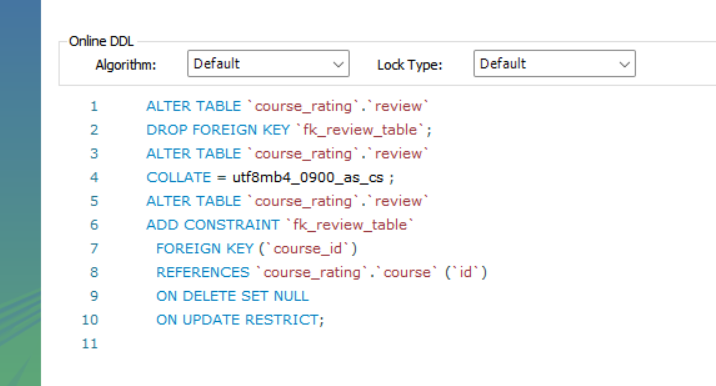 현재 상태의 review 테이블을 만들려면 CREATE TABLE 문을 어떻게 써야하는지 알 수 있음.