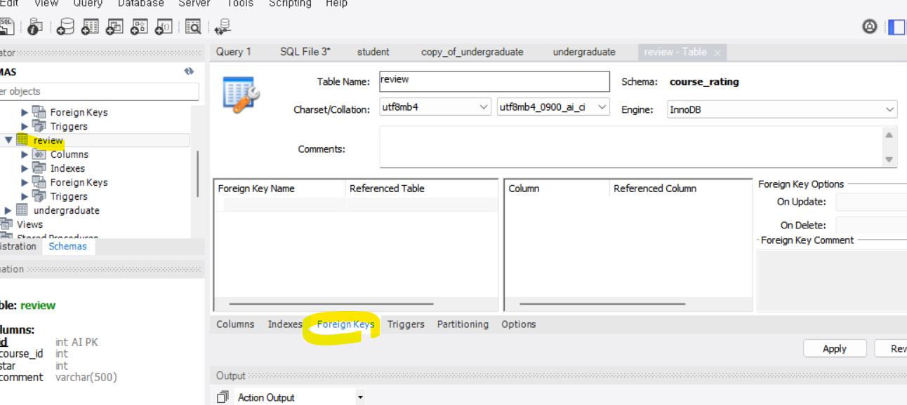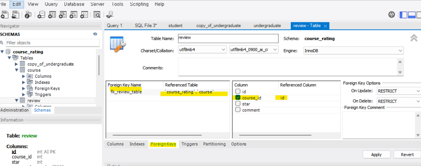 review 테이블을 처음 만들때부터 Foreign Key 설정을 해주려면 이런 식으로 문법을 쓰면 됨.