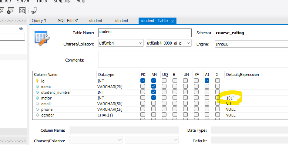 - AI : Auto Increment (증가하는 숫자값을 자동으로 넣어줌), 정수형 데이터타입에서만 가능함.