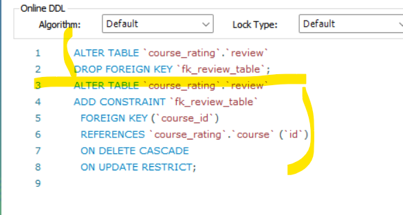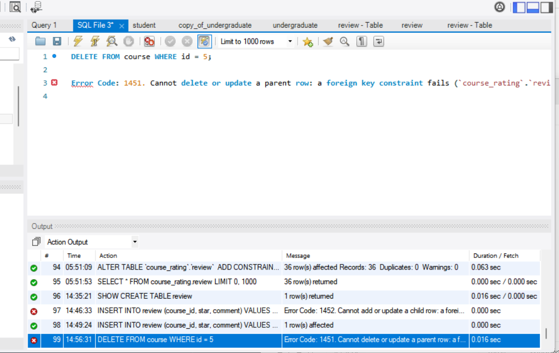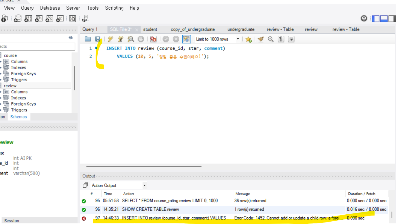 Error Code: 1452. Cannot add or update a child row: a foreign key constraint fails (`course_rating`.`review`, CONSTRAINT `fk_review_table` FOREIGN KEY (`course_id`) REFERENCES `course` (`id`) ON DELETE RESTRICT ON UPDATE RESTRICT)