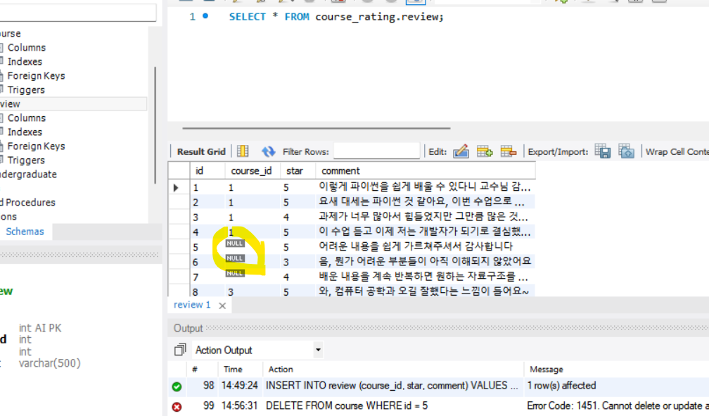 course id가 5였던 리뷰들이 다 사라짐.