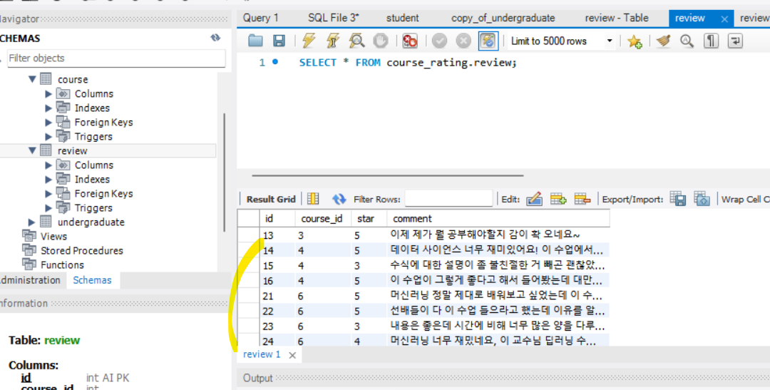 - review 테이블 : 학생들이 남긴 강의 평가들을 저장할 review 테이블