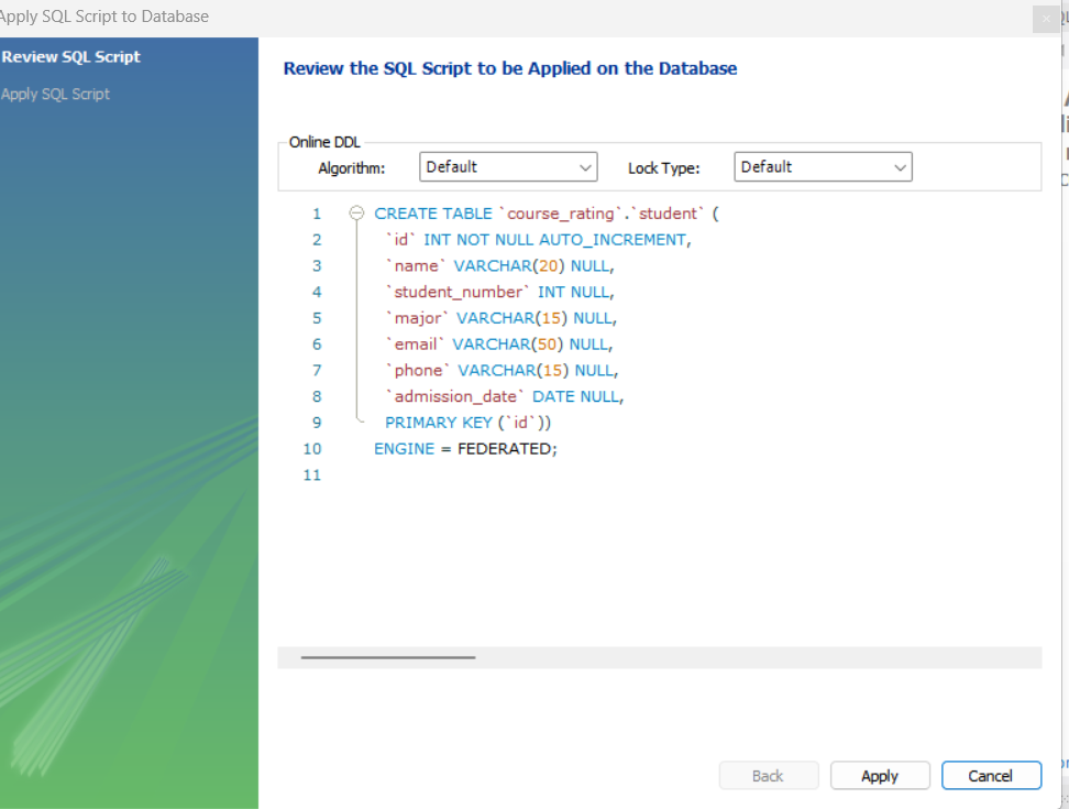 현재 상태의 review 테이블을 만들려면 CREATE TABLE 문을 어떻게 써야하는지 알 수 있음.