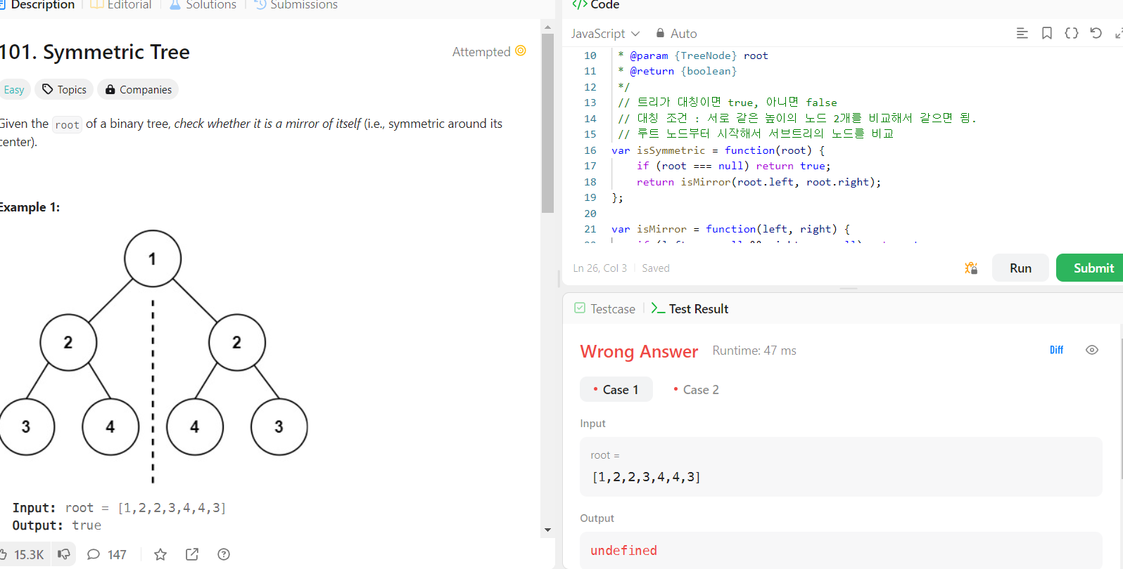 이 문제를 자세히 살펴보니 단순히 노드 모양이 거울반사처럼 대칭인지 확인해야하는 것뿐만 아니라, 두 노드값이 같은지 확인할 필요도 있었다.