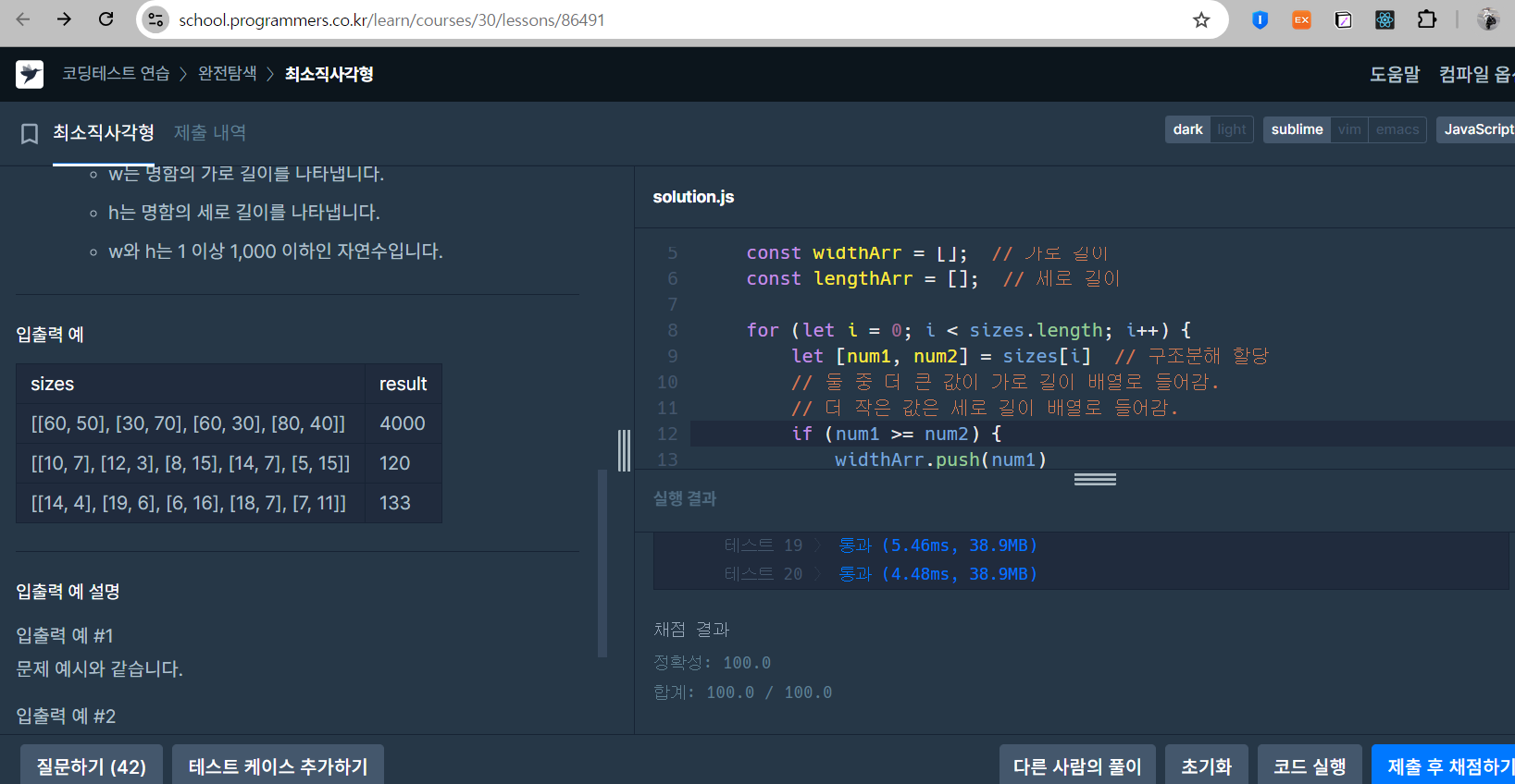 - 모든 명함의 가로 길이와 세로 길이를 나타내는 2차원 배열 sizes가 매개변수로 주어집니다. 모든 명함을 수납할 수 있는 가장 작은 지갑을 만들 때, 지갑의 크기를 return 하도록 solution 함수를 완성해주세요.