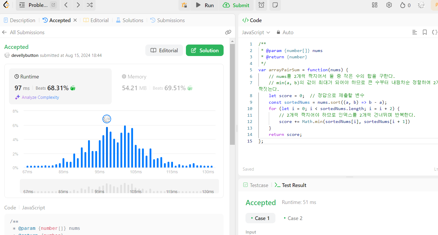 - 내림차순 정렬을 한 후 숫자 2개를 처음부터 짝지었을 때, 어차피 둘 중 오른쪽에 있는 수가 더 작은 수이다.