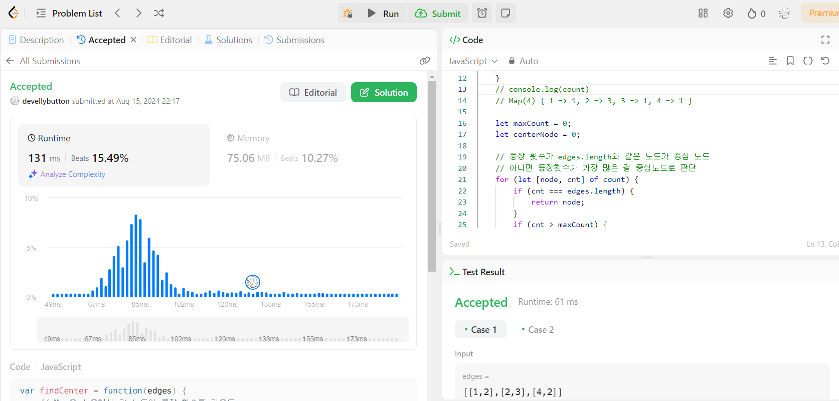하지만 만약 [1, 2], [2, 3], [4, 2], [4, 5] 이런 식으로 중심노드와 연결되어 있지 않은 간선들이 중간에 섞여 있다고 하면, 위의 풀이로는 중심노드를 구할 수 없다. 왜냐하면 위에 있는 풀이는 맨 앞에서 2개의 간선만 비교하므로, 공통된 노드(중심노드)를 찾지 못하는 경우가 생길 수 있기 때문이다.