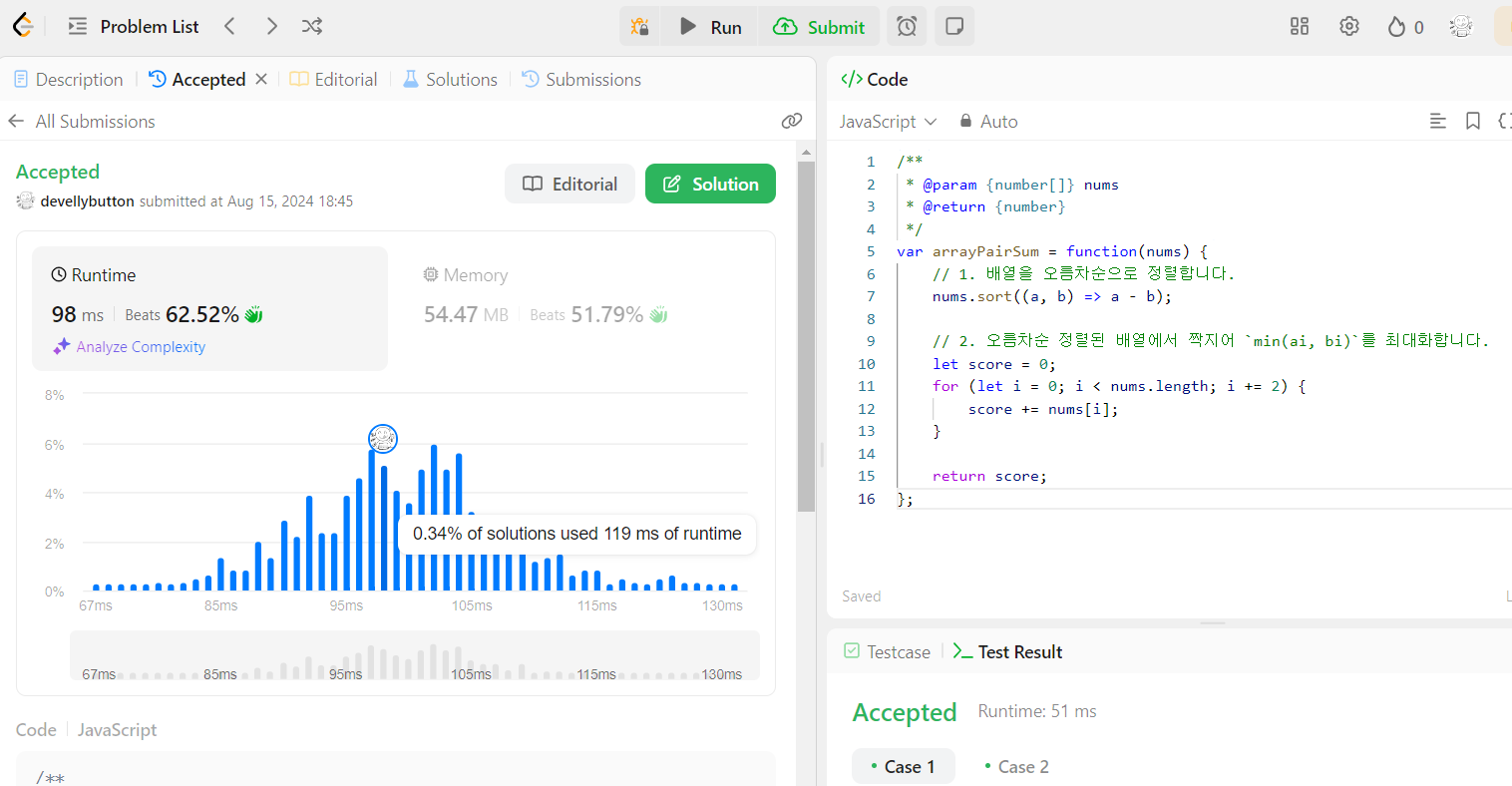 - 주어진 nums 배열을 오름차순으로 정렬하고, 짝지어진 인접한 두 숫자 중 첫 번째 숫자를 더하여 최대의 합을 계산한다.