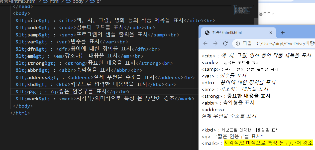 | <mark> | 시각적/의미적으로 특정 문구/단어 강조 노란색 형광펜이 표시됨. |