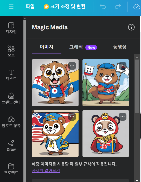 Canva AI한테 '태극기(대한민국 남한의 국기)를 들고 있는 루피(한국 애니메이션 뽀로로에 나오는 비버)를 그려줘.'라고 하니 이렇게 그려놨다.
