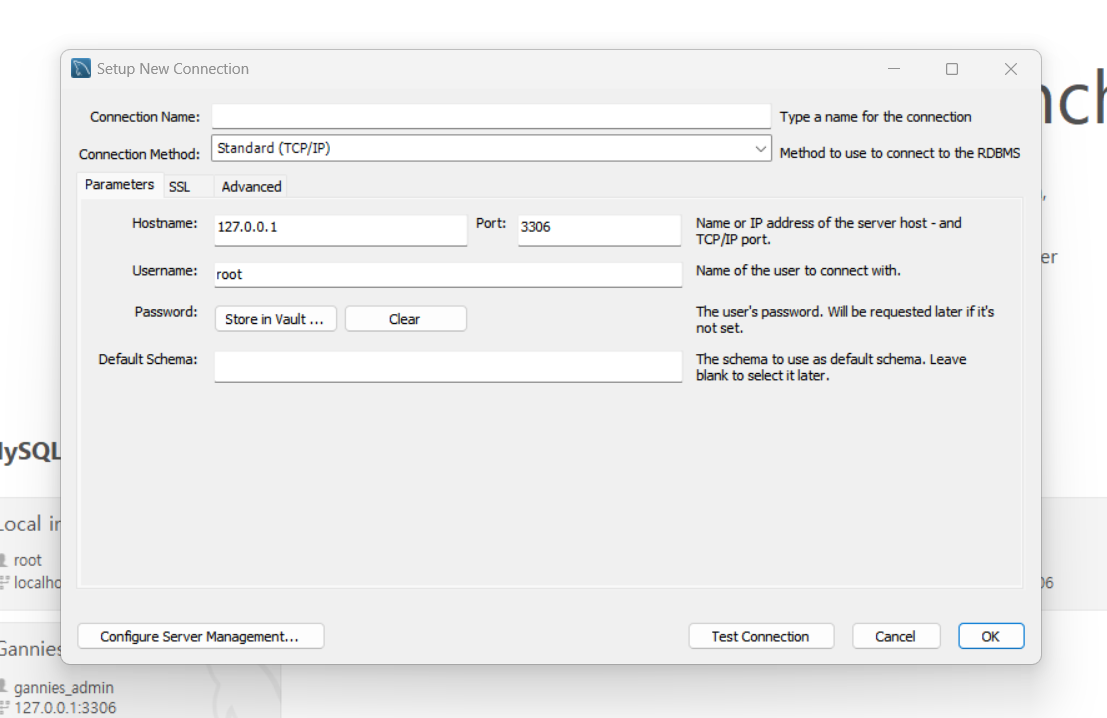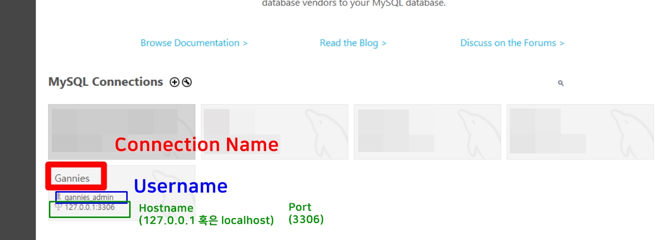 - 주의 : Connection Name과 Database Name을 혼동하지 않도록 주의해야한다. Connection Name은 MySQL 서버에 연결하는 정보이고, Database Name은 실제 데이터를 저장하는 데이터베이스 이름이다.