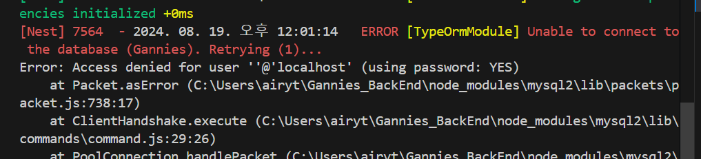- 해결: MySQL 사용자 비밀번호를 orm.config.ts 파일에 정확하게 입력하고, MySQL에서 비밀번호 설정 여부를 확인한다.