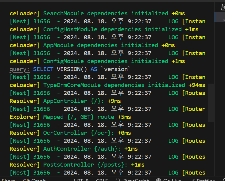 주의할 점은 orm.config.ts에서 정의한 설정은 app.module.ts 파일에서 TypeOrmModule.forRoot(ormConfig())로 주입을 해주어야 한다. 그래야 TypeORM이 MySQL 데이터베이스에 연결할 수 있다.