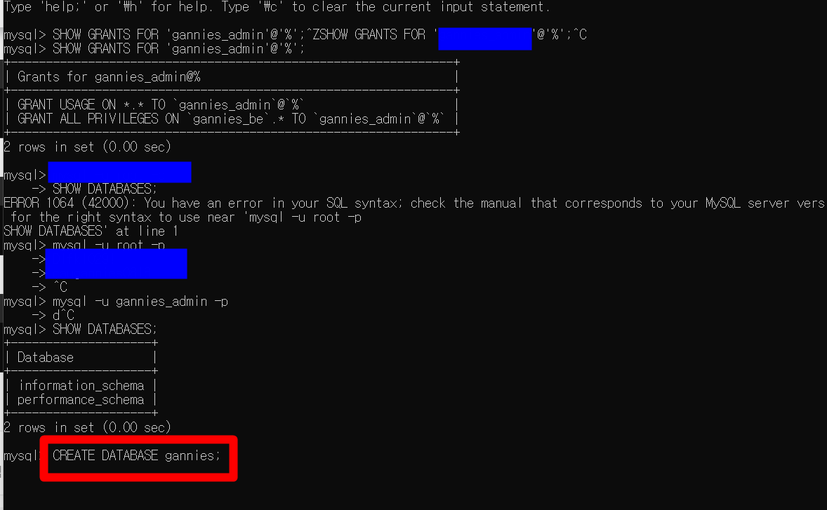 MySQL CLI에서 SHOW DATABASES; 로 Database를 확인한 결과 해당 Database Name이 없었다.