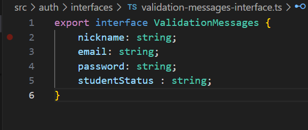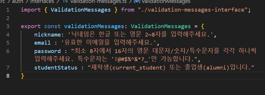 @Matches의 인자로 들어가는 옵션 중 { message: ~~ }는 interface 타입을 생성하여 집어넣었다.