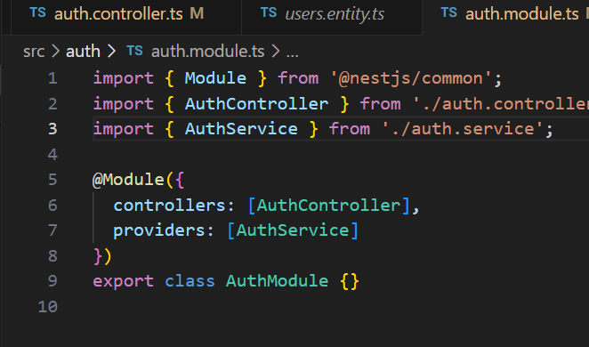 우선 'users' 모듈 안에 정의된 'Users' 엔티티를 'auth' 모듈의 서비스에서 사용해야 한다. 이를 위해 데이터베이스와 상호작용할 Users 엔티티를 먼저 생성해야 한다.