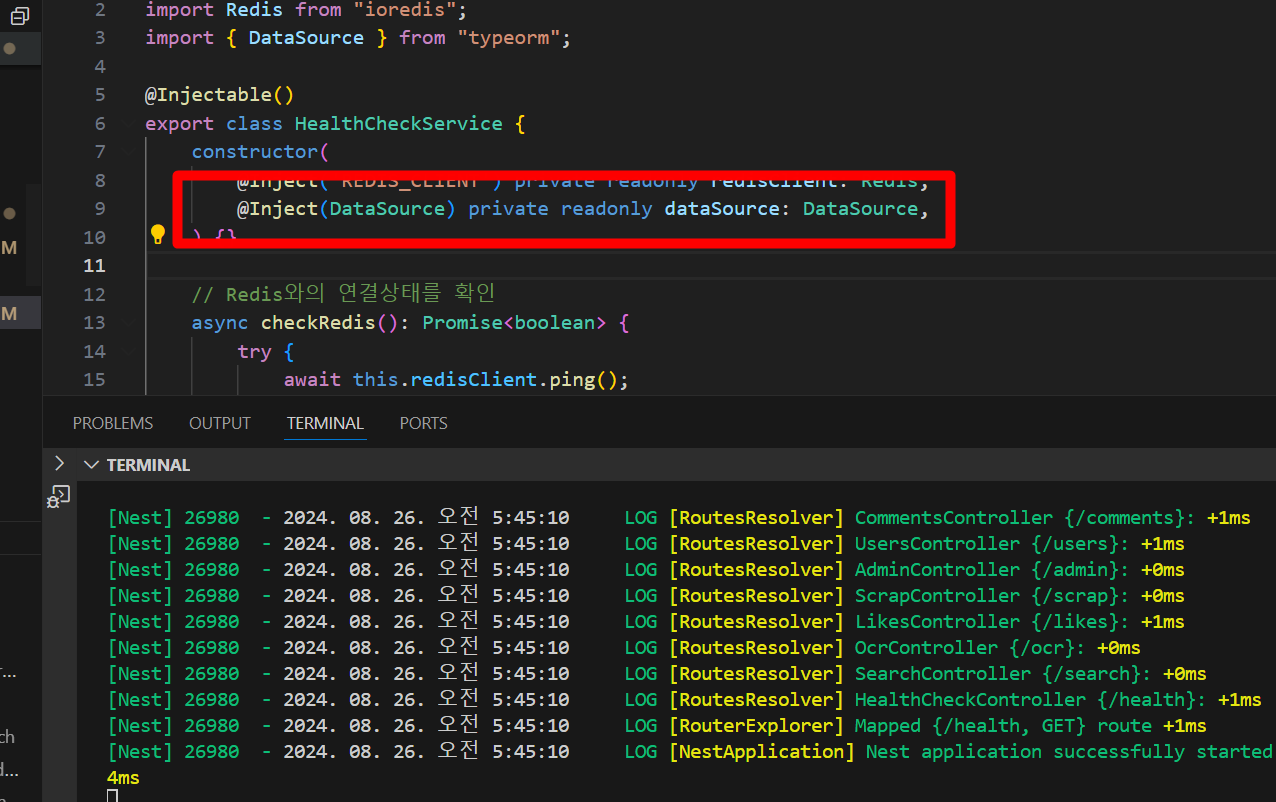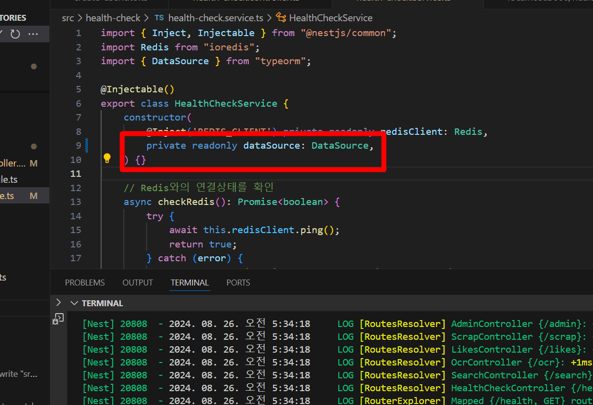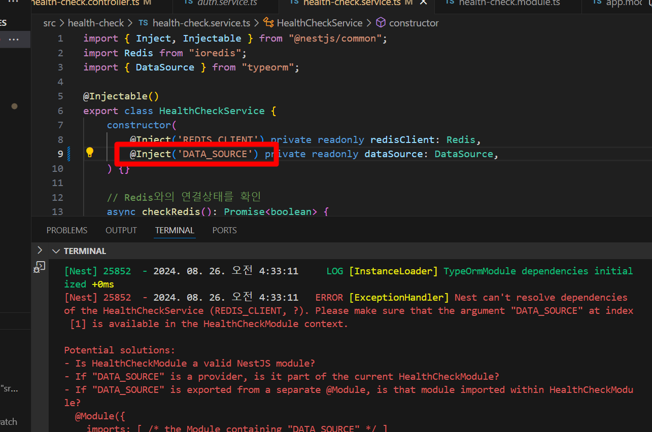 데이터베이스와의 연결 여부를 알 수 있는 healthcheck API를 만들다가 다음과 같은 오류가 발생하였다.